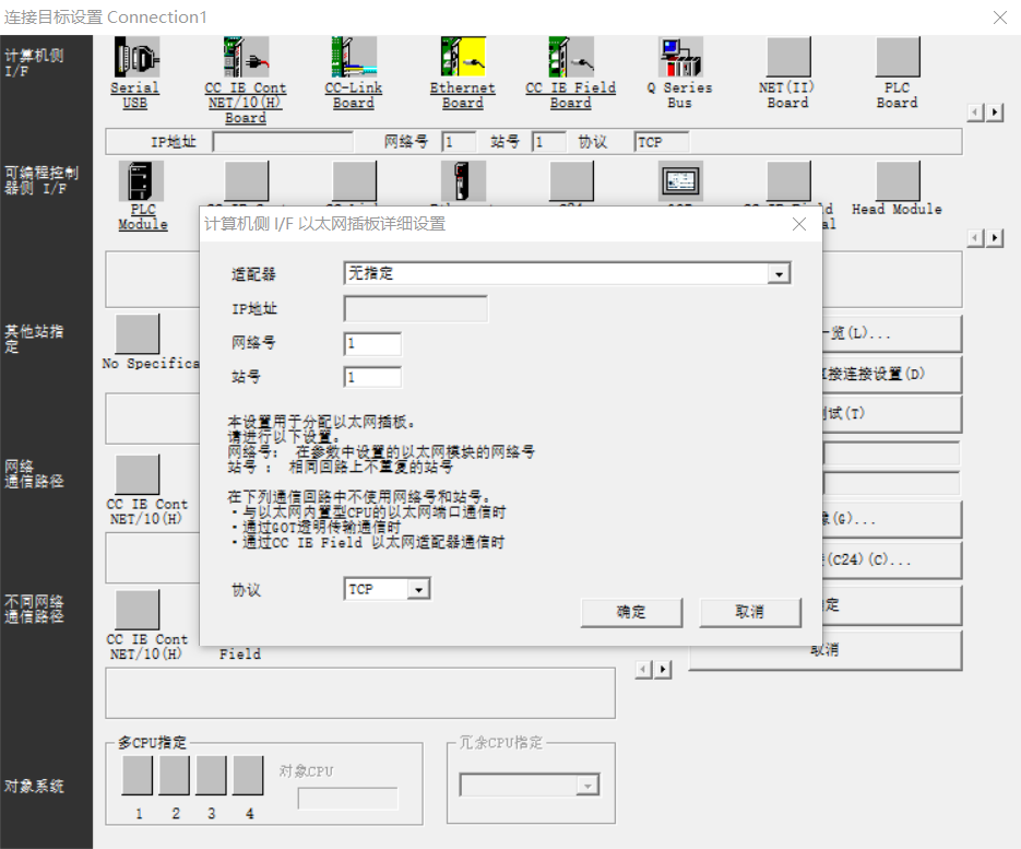 首先用CPU自带以太网端口进行连接,依次选择计算机侧-可编程控制器侧-其它站这三个选项