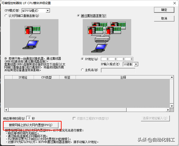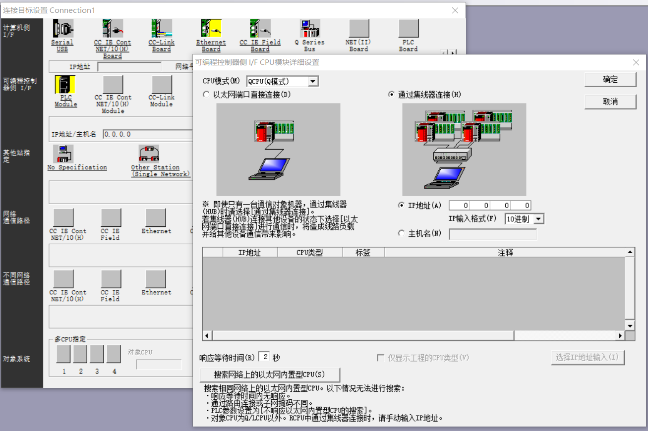 另一种是通过集线器,也就是交换机进行连接,这里需要设置IP地址,要和CPU内置以太网口的IP一致,这里可以通过搜索网络上的以太网内置型PLC进行查找,会显示出IP地址