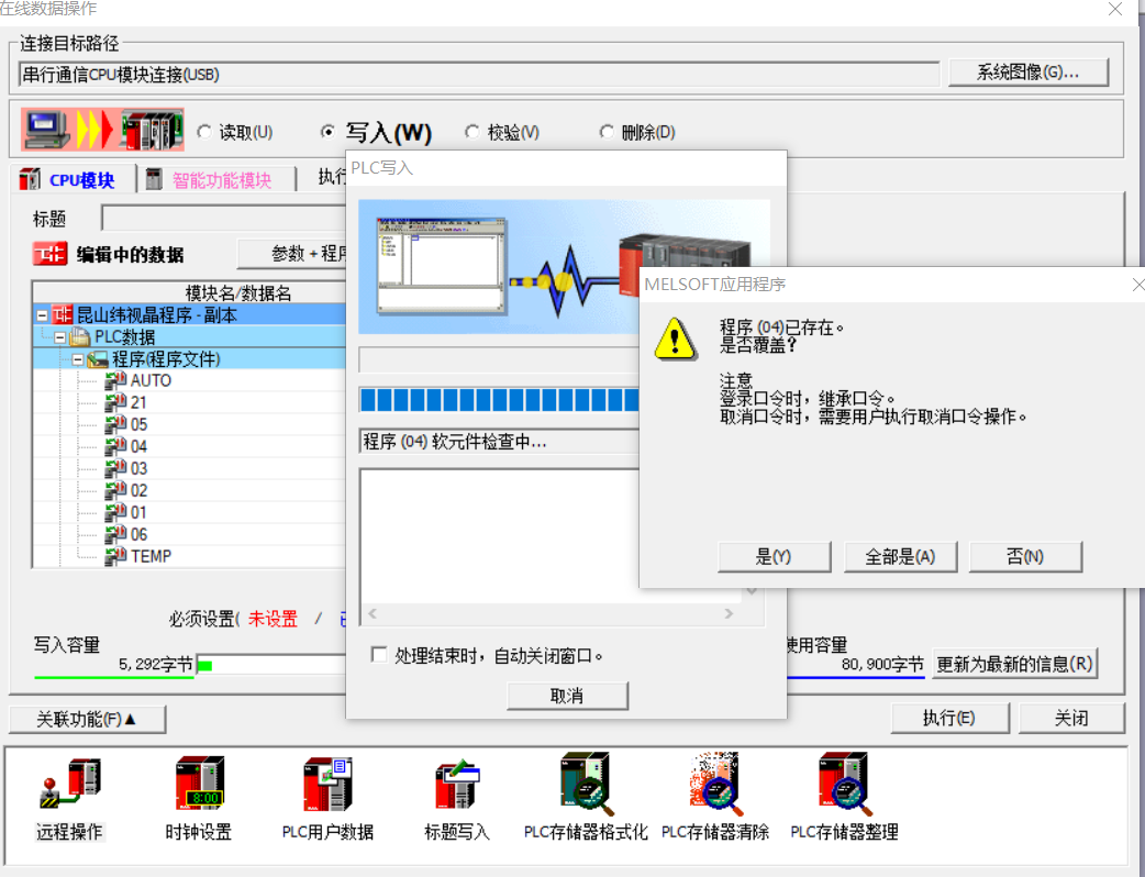 勾选好参数和程序,开始【执行】,参数和标签写入需要将PLC置STOP模式系统才允许写入。所以当软件弹出PLC STOP时,默认选择STOP。如果程序已经存在会弹出确定覆盖页面,视情况选择是或否。