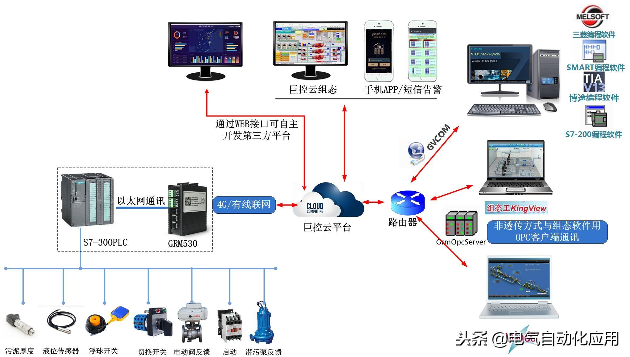 1、 水处理环保行业,现场西门子S7-300PLC以太网方式接入广州巨控GRM530远程模块网口,插上4G卡自动联网,现场不需要设置。远程电脑能上外网安装GVCOM连接软件,使用PLC编程软件即可远程下载,远程在线监控程序。