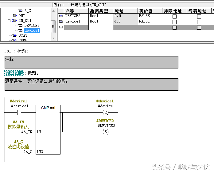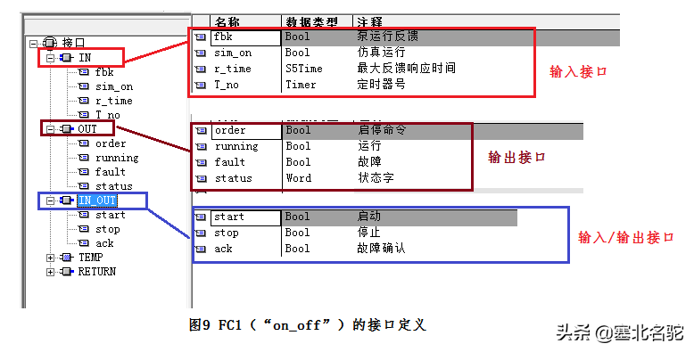 "#start"、"#stop"和"#ack"之所以定义为"输入/输出"接口类型,是因为它们既接受外部的信号,在程序中又作为"线圈"输出。 "定时器号"的形式参数的数据类型为"Timer"。 "#sim_on"是预留的仿真用接口,目前的程序中,它是没用的。 FC中定义的接口变量,在本块中寻址方式为:"#+符号名",如"#start"、"#status"等。相关视频: