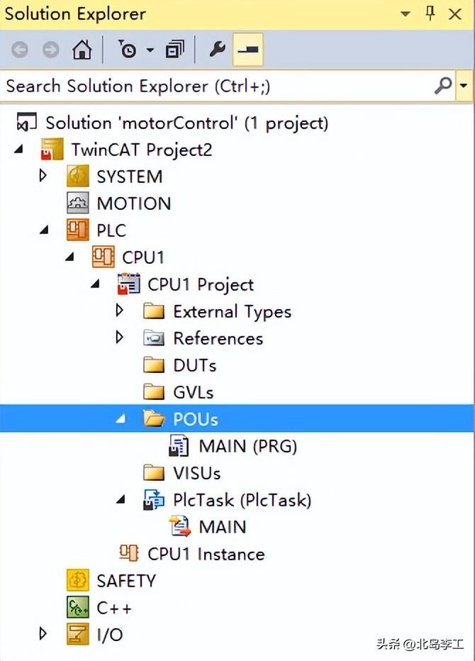 添加完成后,“CPU1 Project”中会有POUs、GVLs、DUTs等文件夹。其中,POU是程序组织单元,GVL是全局变量列表,UDT是用户自定义变量。我们计划编写一个电机控制的函数块,因此在“POUs”文件夹右键单击,在弹出的对话框中选择“添加(Add)”→“POUs”,如下图所示: