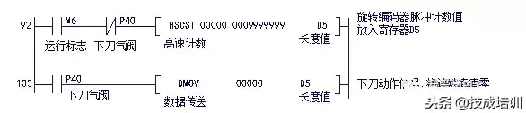 高速计数指令含义。HSCST 0000 0009999999 D5:HSCST 00000为P0、P1端子输入的CW/CCW(正转/反转)计数脉冲;0009999999,为计数设定值,当设定值到时,相对应特殊继电器动作,在这里只是应用其计数功能,不取用对应位元件的开关量信号,故将设定值设得大一点,满足设定长度的要求即可以了;D5,为计数当前值寄存器,若在程序监控状态,可看D5右边显示的当前计数值。这里是将计数当前值,放入D5寄存器中,用于下刀命令和低速命令电路的比较条件。