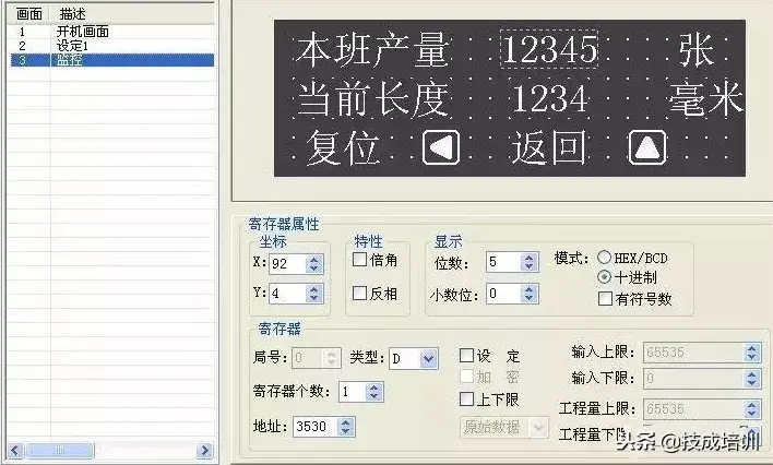 3号画面为监控画面 ,定义了两个数据寄存器,用于本班产量(裁切张数显示)监控的D3530和当前长度(当前板材计量长度)值显示的D3532。数据寄存器的内部数据来自PLC程序电路。
