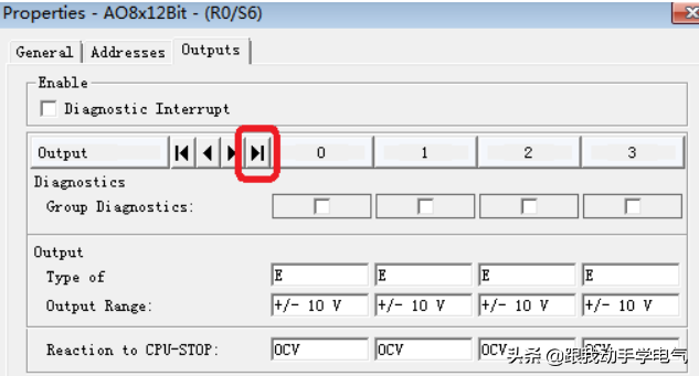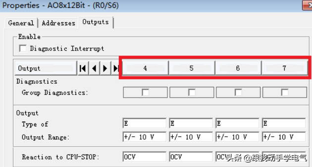 特别需要注意模块6ES7332-5HF00-0AB0,AO8 x12位,其8个输出通道为各自单独配置。组态时需要点击向后选择按钮,以此来选择后4路通道进行配置。
