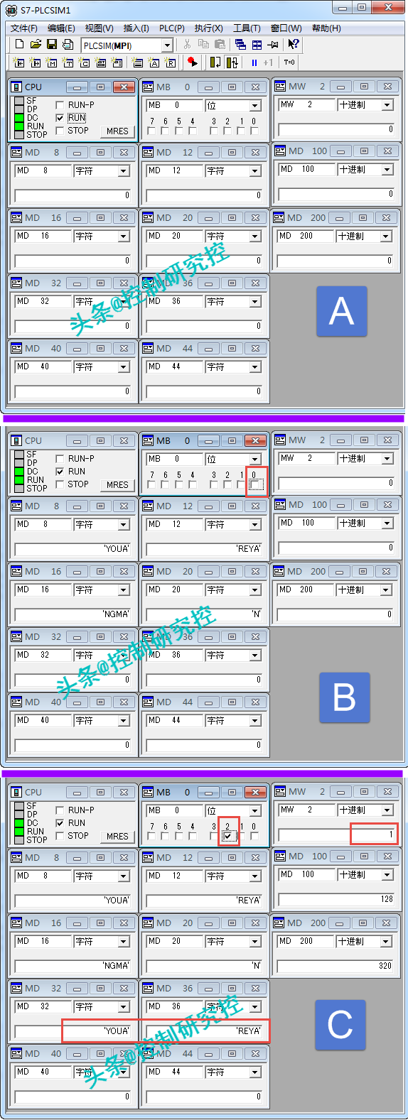 该图片是PLCSIM里边的监控,这次我没有用变量表来监控,就是为了方便把程序的执行过程展示给大家,图片中是A,B,C分别代表程序执行的3个阶段。