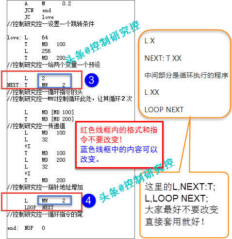 图中程序段的第二行,我用红框标示出来的①和②,就是LOOP指令的使用方法。大家可以看到我对程序的备注,①处我备注的是循环指令的头,②处我备注的是循环指令的尾,其实在STEP7的帮助文件中没有对这个头尾进行太多的解释,但是我个人看过的所有LOOP循环程序中都是这样使用的,因此这个用法是一种规定规则性用法,大家需要遵照!