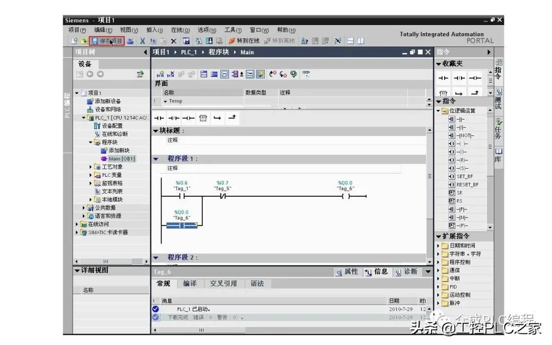 在项目视图右侧的指令中打开位逻辑运算文件夹,选择一个常开触点,双击或拖放到编程区域,输入地址I0.6做为启动触点。编辑器自动为I0.6生成了变量名称Tag_1,可以在PLC变量表中修改。串联一个常闭触点,输入地址I0.7做为停止触点。拖放一个输出线圈,输入地址Q0.0,做为起保停电路的输出线圈。在常开触点I0.6的下方并联一个Q0.0的常开触点,做为自锁触点。这样,一个简单的起保停控制程序就完成了。单击保存项目按钮,保存项目。