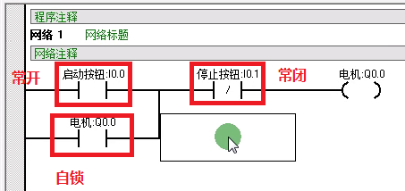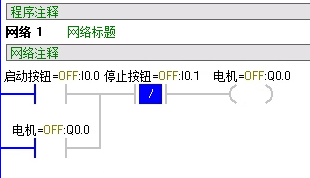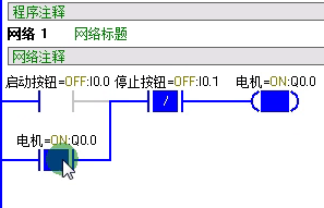 在这个程序中,我们可以看到在启动按钮按下后,能流通过常闭按钮到达电机Q0.0。这是Q0.0位置的常开触点闭合,实现自锁保持。这时,I0.0恢复常开状态,能流将从下方的线路流过,保持电器的启动状态。