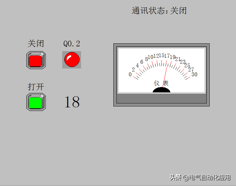 组态王编写的人机界面可以控制并监测PLC的寄存器状态。左上角的按钮可以控制M0.0的关断,从而可以控制计数器的复位,计数器可以对左下角的按钮按下次数进行计数,计数值可以直接显示,也可以通过仪表显示。
