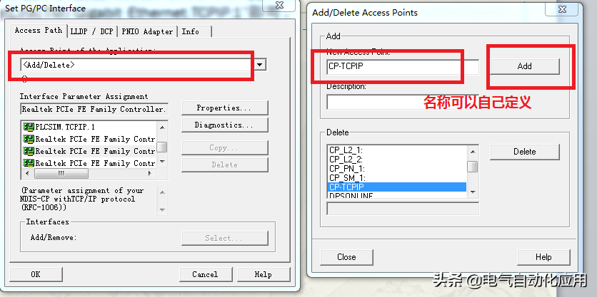 在 Interface Parameter Assignment Used 中点选Realtek PCIe FE Family Controller.TCPIP.1(注意:应根据运行计算机实际工作的网卡名进行选择,务必选择不带Auto 的),然后Access Point of the Application 内显示“CP-TCPIP - Realtek PCIe FE Family Controller.TCPIP.1 即可。