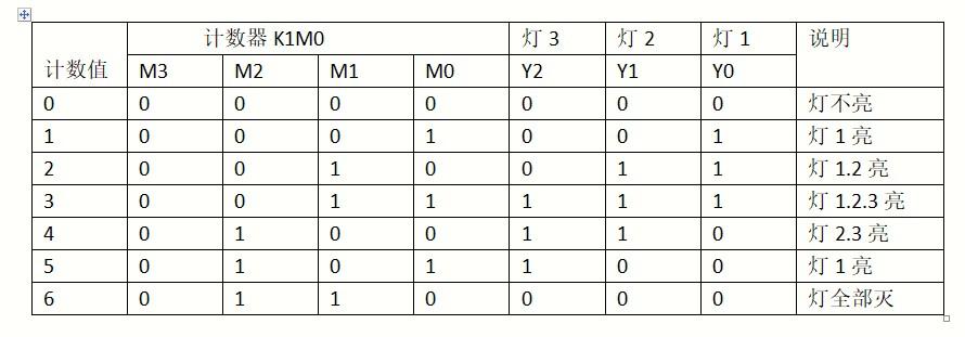 根据控制要求,可用加一指令INC组成一个计数器,计数值用K1M0表示,用计数结果控制三个灯的组合状态,计数器数值与三组灯的逻辑关系如下: