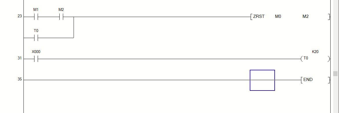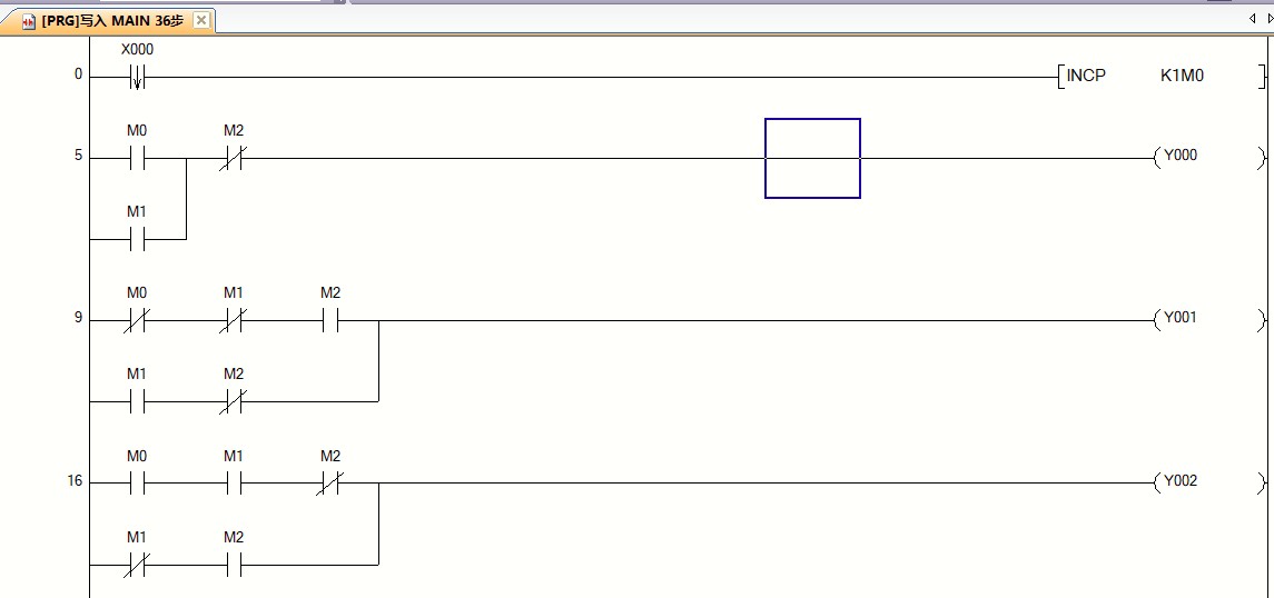 这个梯形图的设计思路就是:我们直接把我们在前面设计好的逻辑表达式转化过来即可。比如Y0的逻辑表达式:(M0+M1)*M2的反,在PLC中就可以表示为LD,M0,ANI,M2,OR,M1,OUT,Y0。