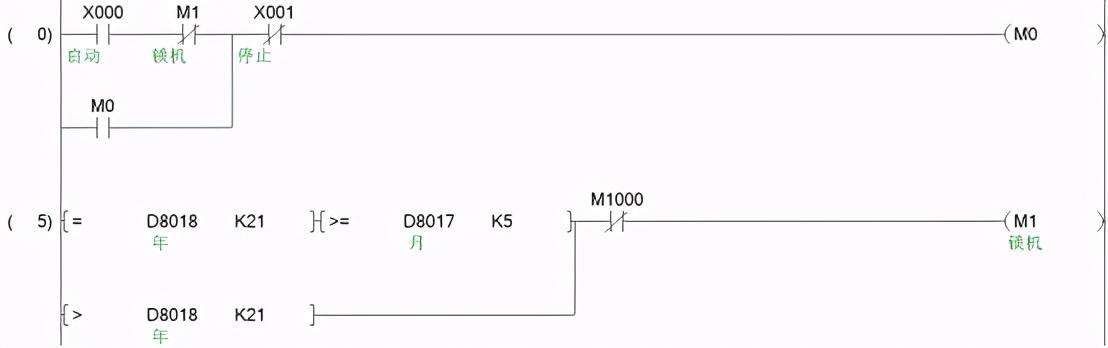 可以读取plc的日期,用比较指令进行比较,满足以下条件就触发对应的M1点,在2021年时要大于5月份,或者大于2021年份的时间。条件满足就导通M1断开启动的按钮,不是直接控制设备停止,这样做更好一点