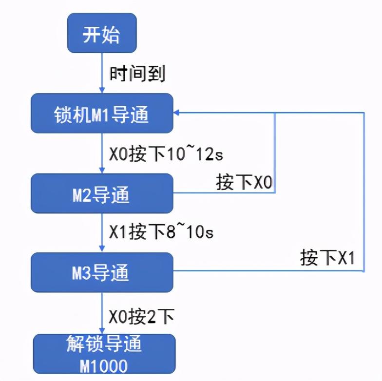 在M3的条件下,如果按下X1,就会复位M2、M3,回复到初始状态,如果按2次X0按钮,就会触发C0计数器,计数一到,复位M2、M3的同时,置位M1000,解除锁机,该点可以掉电保持,重新启动机器就不需要重复解锁了