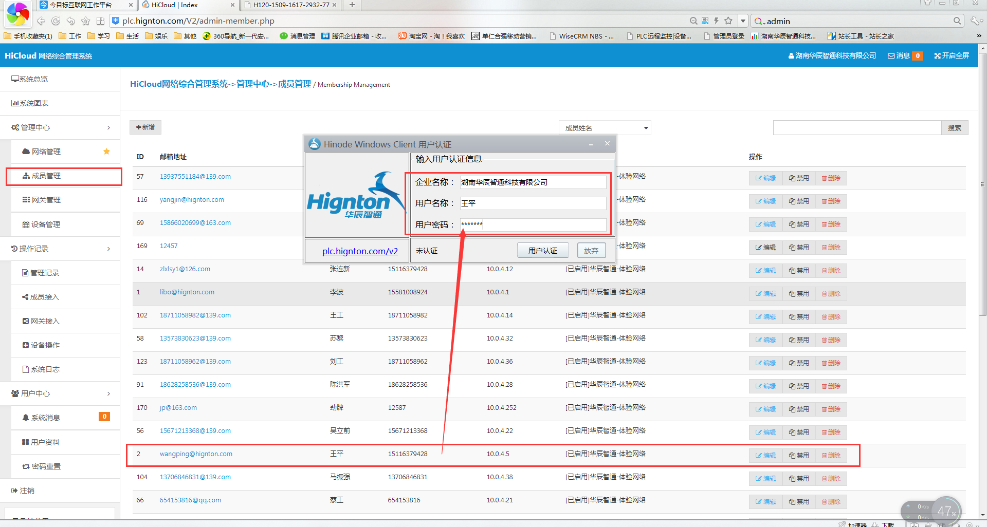6 在HINET云服务器上添加AC 500这台PLC设备; 6.1 IE浏览器中输入HINET云服务器地址:plc.hignton.com/v2,并输入正确的企业账户及密码(默认情况下企业名称就是客户所在企业的全称,密码是12345678);