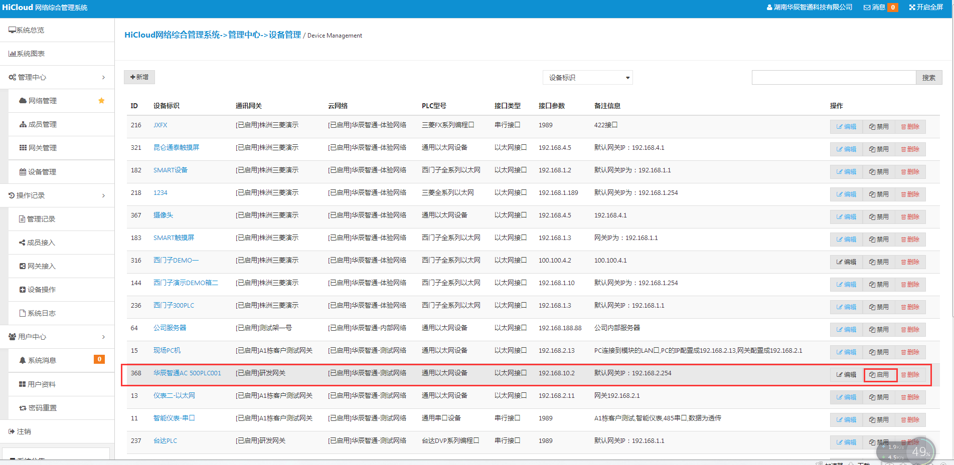 6.2 点击“设备管理”,进入设备管理页面,这里的设备就是指PLC等设备;