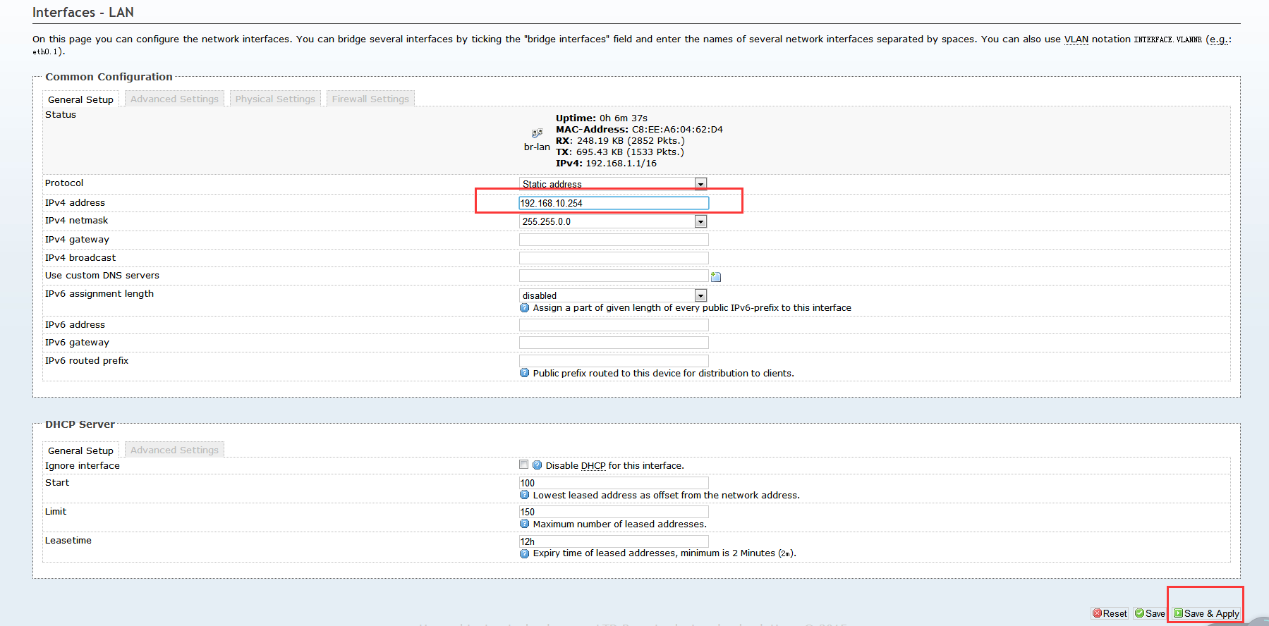 3.7 修改IP为192.168.10.254 并点击“Save&Apply”。(其他配置均不需要改变)