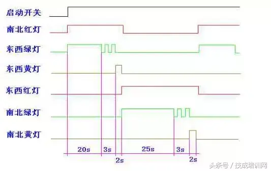 (3)南北红灯亮维持 25s。在南北红灯亮的同时东西绿灯也亮,并维持 20s。到 20s 时,东西绿灯闪亮,闪亮 3s 后熄灭,此时,东西黄 灯亮,并维持 2s。到 2s 时,东西黄灯熄灭,东西红灯亮。同时, 南北红灯熄灭,南北绿灯亮。