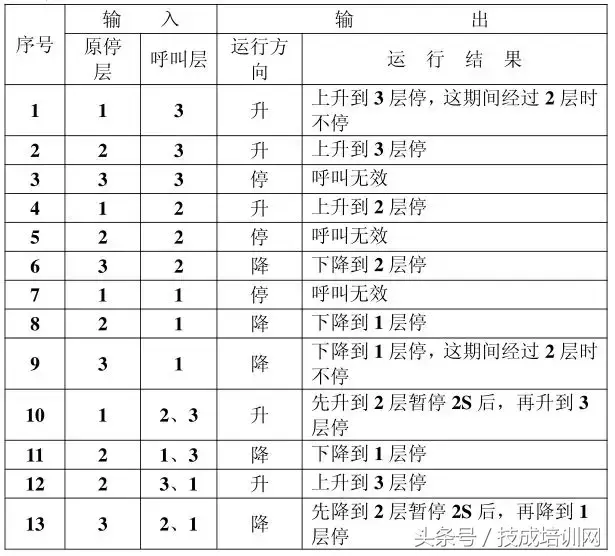 (2)电梯箱体上升途中只响应上升呼叫,下降途中只响应下降呼叫,任何 反方向呼叫均无效,简称为不可逆响应。具体动作要求,如下表。