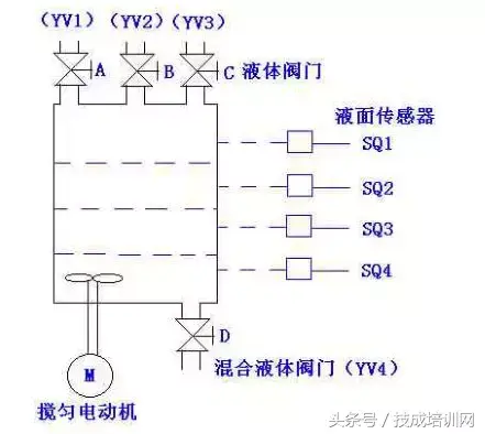 多种液体自动混合装置的 PLC 控制 如图所示为三种液体混合装置,SQ1、SQ2、SQ3 和 SQ4 为液面传感器, 液面淹没时接通,液体 A、B、C 与混合液阀由电磁阀 YV1、YV2、YV3、 YV4 控制,M 为搅匀电动机,其控制要求如下: