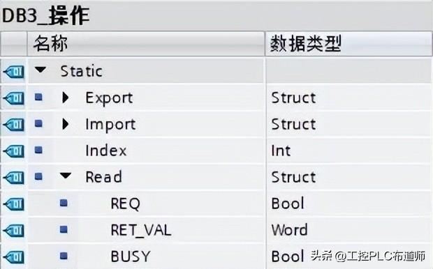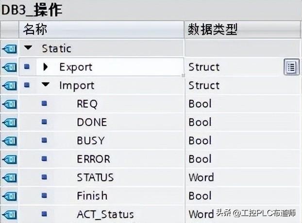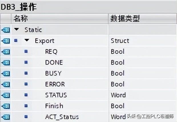 首先新建DB块,用于调用块的请求与状态位等,名称为"DB3_操作",建立结构体"Export",以及相关变量,如图7所示。