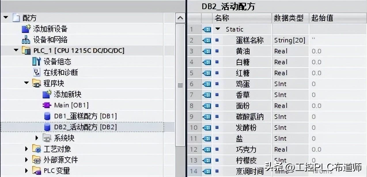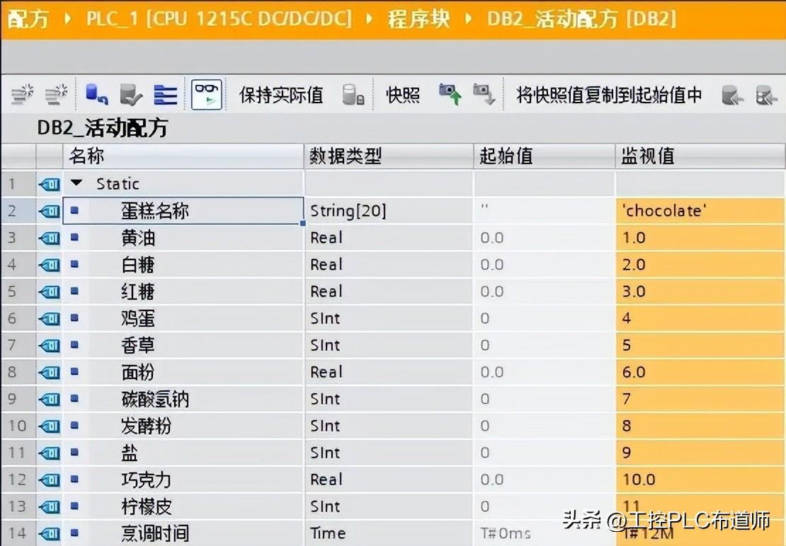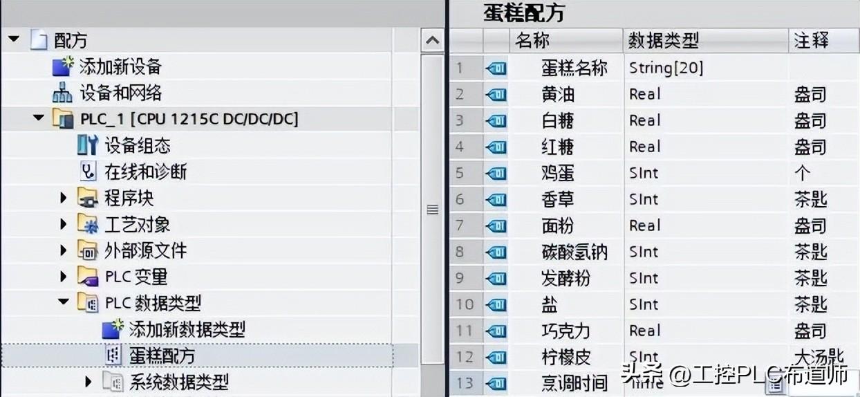 在此,创建一个 PLC 数据类型,以定义一个配方记录中的所有组成,以制造蛋糕为例,建立UDT过程参见链接 ,建好后如图2所示。