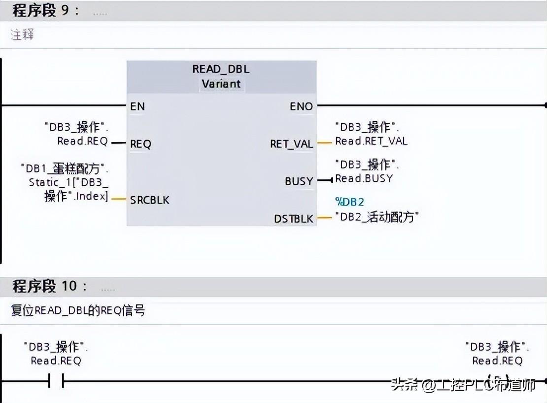 经过使用配方指令或者直接在配方数据块的编辑,此时配方数据已经保存在PLC的装载存储器中,需要使用READ_DBL指令读取出来。可以在DB块"DB3操作",建立一个Int类型变量Index用作配方编号。对于本例,配方数组限值为0-7,所以该配方编号变量取值范围也是0-7,可以在HMI画面上设置该值,也可以在程序中设置该值。此外同样在DB块"DB3_操作",建立结构体"Read",以及相关变量,用于READ_DBL的请求与状态位,如图11所示。