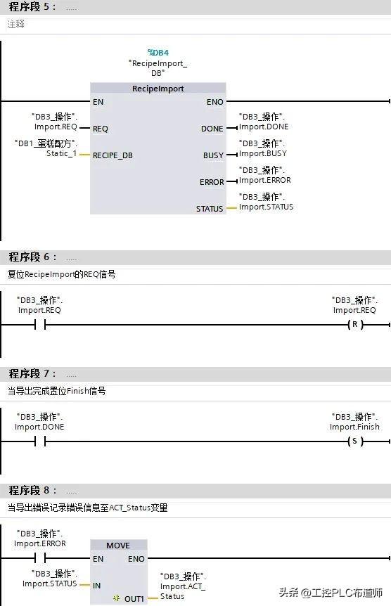 在本例中,直接在OB1使用LAD语言调用RecipeExport和后面的RecipeImport块,实际使用时可以在FC/FB,或者FB的多重背景中使用,语言也可以使用FBD、SCL。