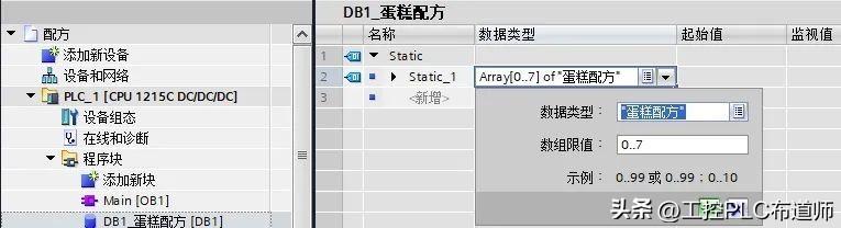配方数据块必须包含数组,可以是一维的也可以是多维的,数组元素是 PLC 数据类型或结构。在这个配方实例中使用 PLC 数据类型创建配方数据块。
