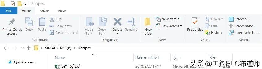 6. CPU断电,将存储卡取出,将插好 S7-1200 存储卡的读卡器插入 PC,以U盘形式打开该卡,打开 \Recipes 目录,找到配方文件。本例中和图6问题相同,中文名称出现乱码,如图 10 所示。但是这里注意,不要修改该名称。