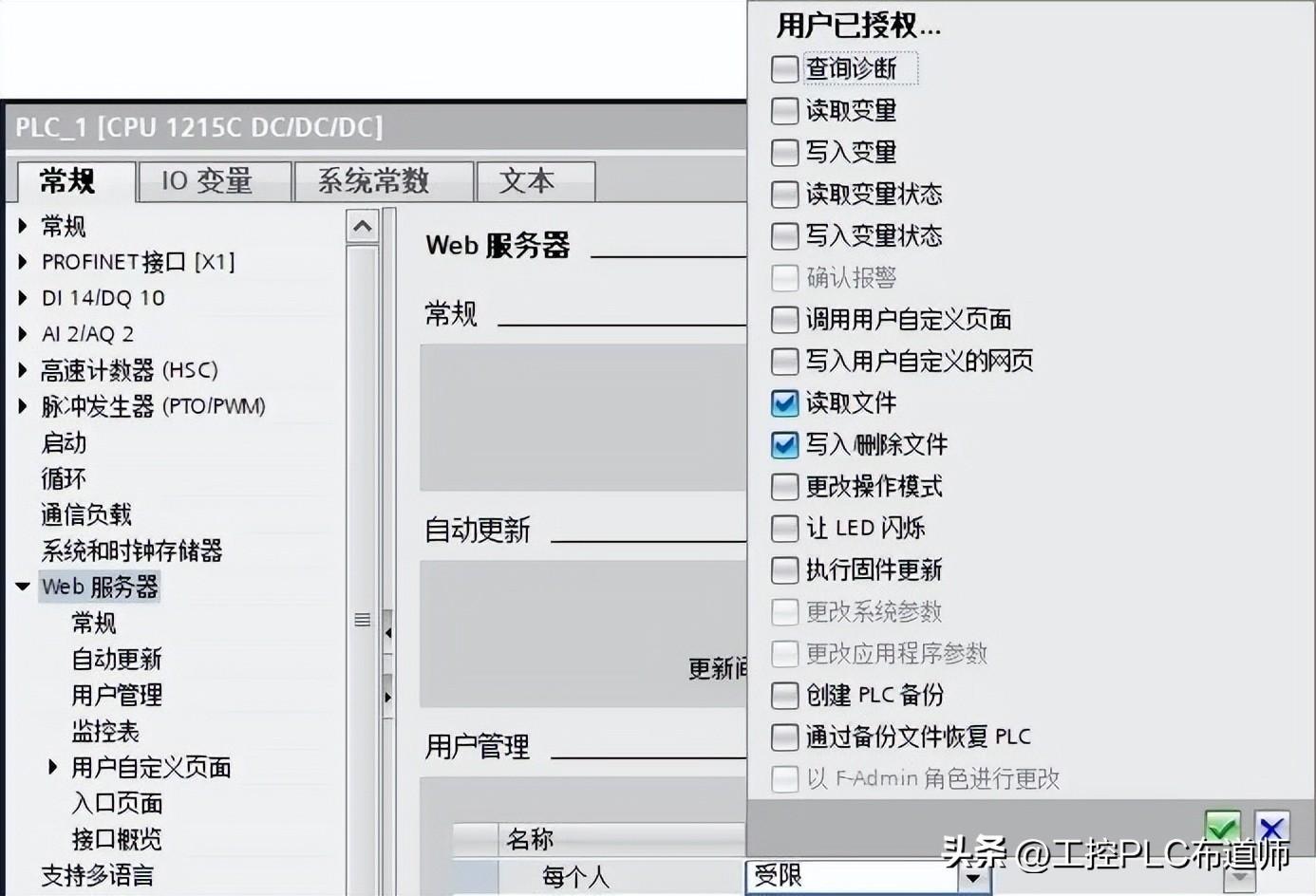 在目标 CPU 的设备配置中启用 Web 服务器,具体参考Web服务器配置。使用配方功能,需要具有“读取文件”和“写入/删除文件”功能。若要求更多访问功能,可以勾选相应权限。本例中只用默认用户,实际可以根据需要设置用户及权限,如图 1 所示: