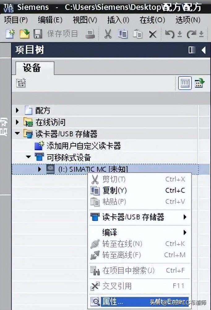 2. 在 TIA PORTAL 软件中按照以下路径和方法打开存储卡:“项目树”→“读卡器/USB 存储器”→“鼠标选中需要打开的存储卡盘符”(如下图所示的 I:)→“鼠标右键”→属性”,如图 8所示:
