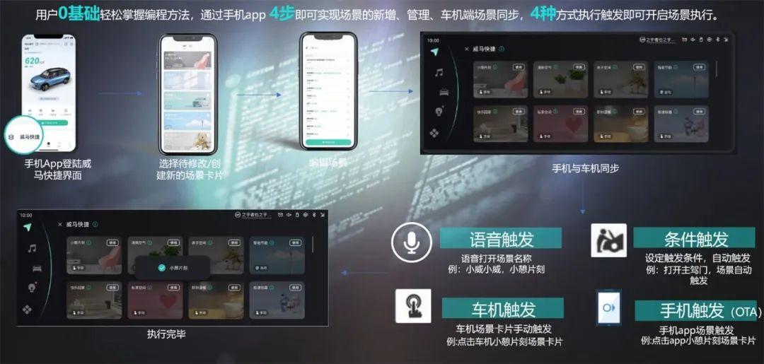 比如,过去更传统的以机械传动为基础的车辆,很难做到用语音来控制车窗和空调,而未来的SOA就是将汽车上的各个模块各个硬件全部打碎并建立联系,以此构建一个基础平台,在这个平台上进行各式各样的开发和编辑,威马W6的SOA应用方式就是基于这个概念,所推出的“场景编程”。