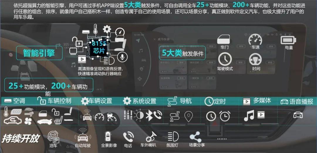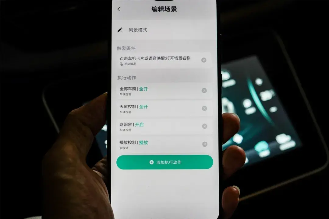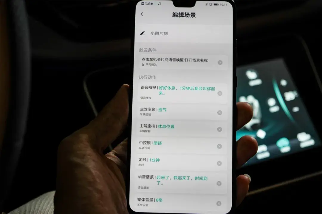 举一反三,“赶路场景”会自动关闭车窗,切换为运动模式,播放激昂的歌单;“休息场景”会自动放倒前排座椅,以小音量播放舒缓的音乐,空调开启外循环;那么还能想到“会议场景”、“求婚场景”、“派对场景”等,车辆具备的硬件功能越丰富,支持开放的接口越丰富,其定制化场景就越丰富,能够实现的功能也越多样化。