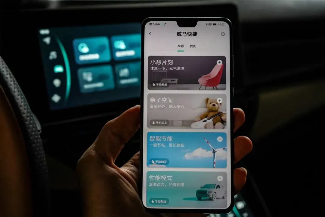 威马的场景编程支持用户对车辆设置进行自由组合和设定,包括驾驶辅助配置、车窗、座椅、空调、驾驶模式、音乐、氛围灯等硬件模块,来适配不同场景,目前W6车辆上预设了5种场景模式,即“小憩片刻”、“亲子空间”、“智能节能”、“性能模式”、“高速省心”,用户也可以自由创建其他场景。