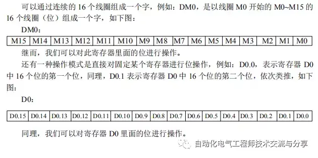 (2),D数据寄存器,一个“数字”大小为一个字(16位),两个“数字”为双字(32位)。如D0为一个字,D0-D1为双字。