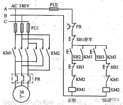 电路图讲解:从图中应该很简单看出来,当按下SB2,KM1接触器得电,电机正传,KM1常开触点闭合形成自保电路,KM2的常闭触点作为互锁保护,当按下SB1时,电机停止;反转同理。