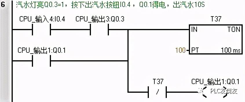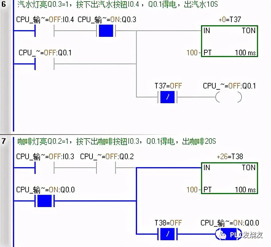 第三步: (出咖啡时Q0.0常闭接点断开,咖啡灯闪。当Q0.3得电,汽水灯亮时,按下出汽水按钮I0.4,Q0.1得电自锁,出汽水,定时器T37得电延时7s关断Q0.1,当Q0.2得电,咖啡灯亮时,按下出咖啡按钮 I0.3,Q0.0 得电自锁,出咖啡,定时器T38得电延时7s关断Q0.0。)