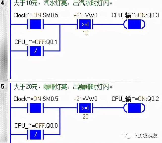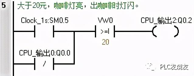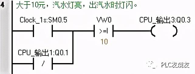 第二步: (当VW0≥10时,Q0.3得电,汽水灯亮,出汽水时Q0.0常闭接点断开,汽水灯闪,当VW0≥20时,Q0.3也得电,汽水灯亮,当VW0≥20时,Q0.2得电,咖啡灯亮。)