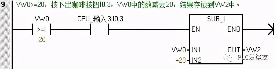 第九步: (VW0>=20,按下出咖啡按钮I0.3,VW0中的数减去20,结果存放到VW2中。)