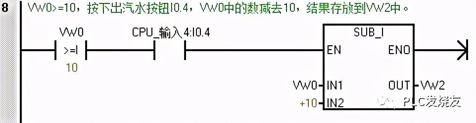 第八步: (VW0>=10,按下出汽水按钮I0.4,VW0中的数减去10,结果存放到VW2中。)