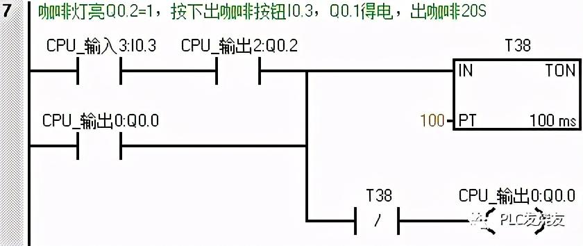 第七步: (咖啡灯亮Q0.2=1,按下出咖啡按钮I0.3,Q0.1得电,出咖啡20S)