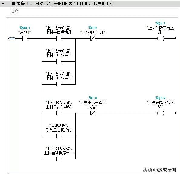 (4)该段位于上料系统的逻辑控制子程序(FC20),图为升降平台自动启动步序一。