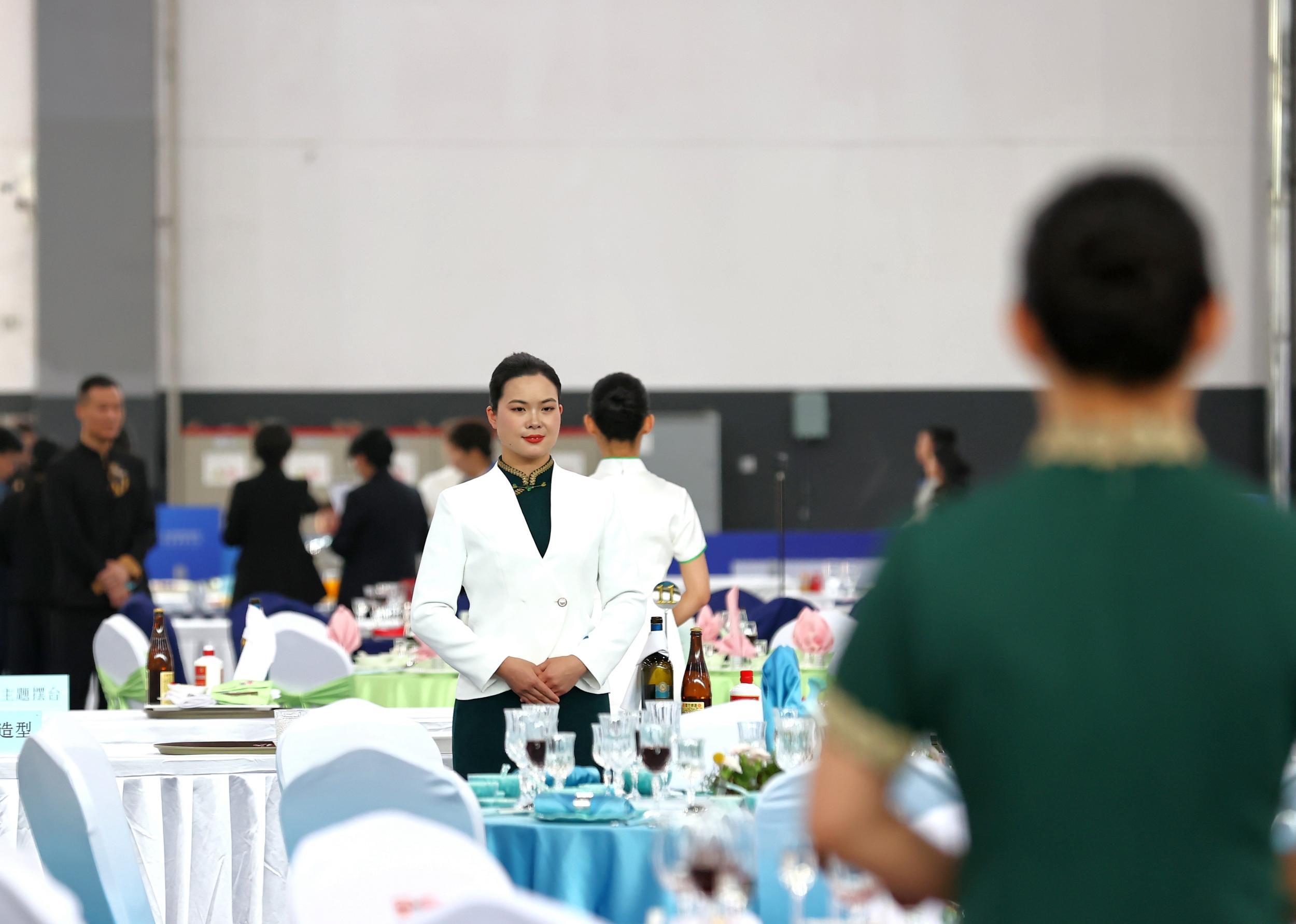 餐厅服务赛项中,张国艳、赵悉楠分别在职工组、学生组进行主题宴会设计、现场讲解答辩、宴会摆台、插花和工艺品组合设计等内容的比拼。