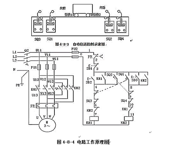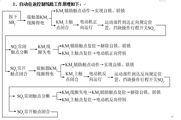 自动往返控制在许多生产机械中,常需要控制某些机械运动的行程,即某些生产机械的运动位置,例如,生产车间的行车运行到终端位置时需要及时停车,铣床要求工作台在一定距离内能自动往返,以便对工件连续加工,像这种控制生产机械运动行程和位置的方法叫做行程控制,也称限位控制。
