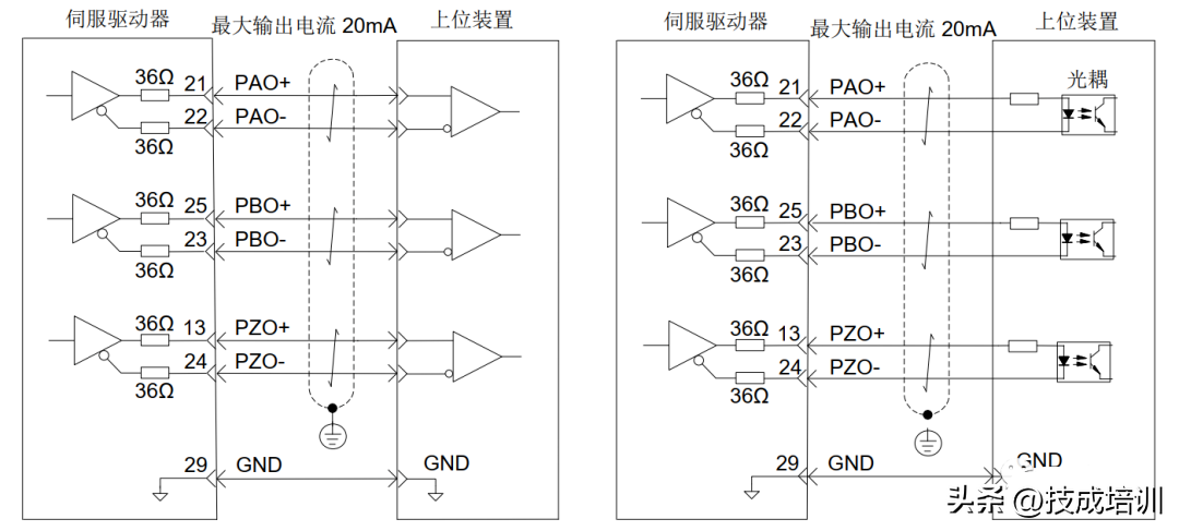 编码器分频输出电路通过差分驱动器输出差分信号,上位机请使用差分或光耦接收电路接收,最大电流为20ma。