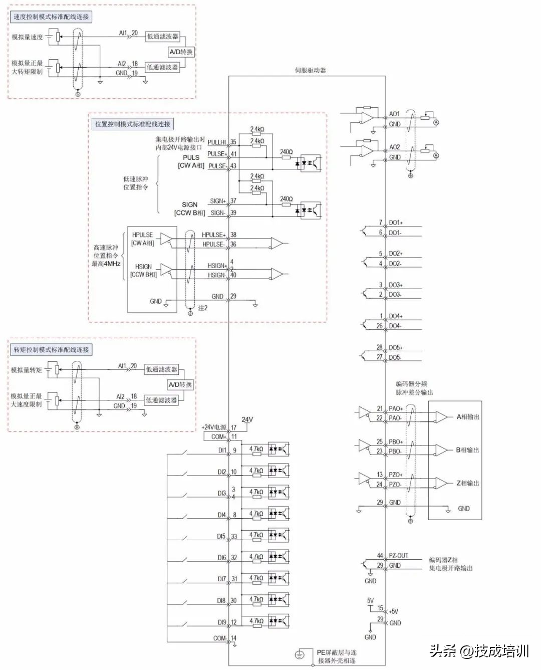伺服驱动器如何与1200 PLC连接,伺服通常有速度控制模式,位置控制模式和转矩控制模式三种,各自连接配线如下图所示,使用最多的是位置控制模式。