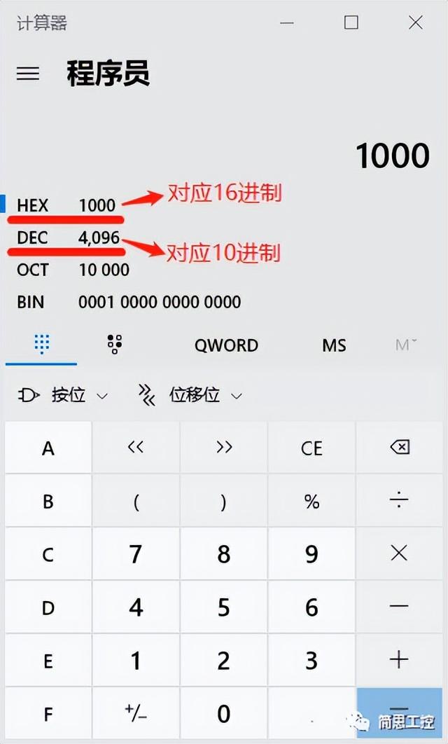 计算器的“HEX”一栏,表示16进制,在这里输入伺服电机的清零地址单元1000(地址单元是0x1000,只要输入1000);