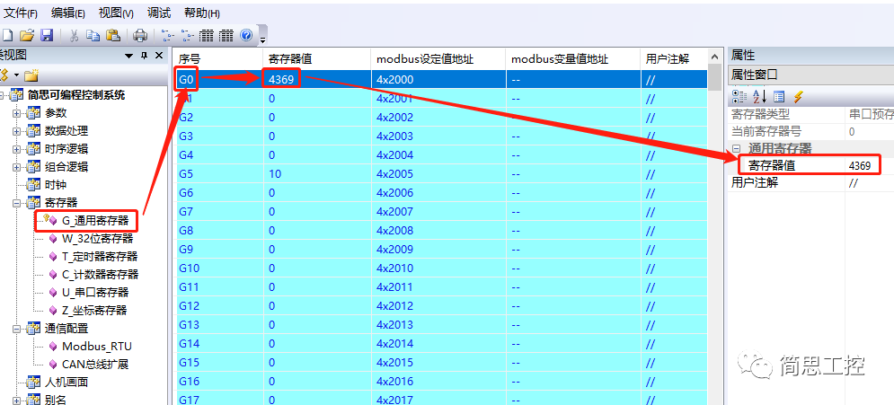 伺服电机清零的数据是0x1111换算成十进制就是4369,也就是G0的数值是4369,我们可以直接在寄存器值那里填写4369。
